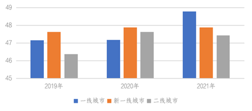 雖然新青年成為消費的主力軍,但是,不同能級城市的平均置業能力也有明顯的差異。由于更多的流動人口向一、二線城市聚集,一、二線城市的購房成本持續走高,平均置業年齡高于其它能級城市。據《2021居住客群消費趨勢年報》研究顯示,2021年1至10月,一線城市購房平均年齡約為36.9歲,高出新一線城市2.7歲,高出二線城市2.1歲。