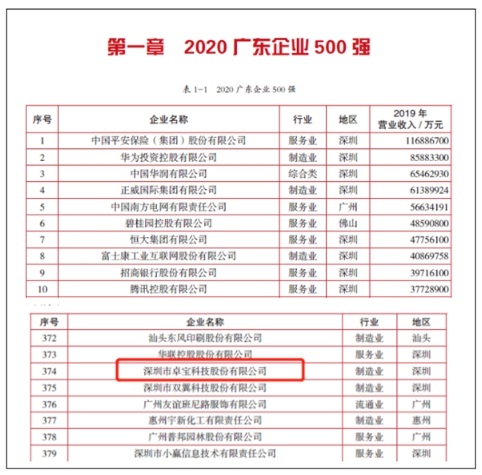 日前,《2020廣東500強企業發展報告》正式出版,報告中發布了多份榜單,卓寶憑借強大的企業實力與技術創新能力上榜“廣東企業500強”、“廣東創新企業100強”。