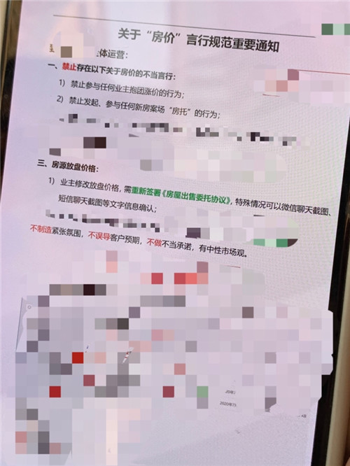 記者發(fā)現(xiàn),有中介機構(gòu)已經(jīng)內(nèi)部要求從業(yè)人員“禁止參與任何業(yè)主抱團漲價的行為;業(yè)主修改放盤價格,需重新簽訂《房屋出售委托協(xié)議》”。