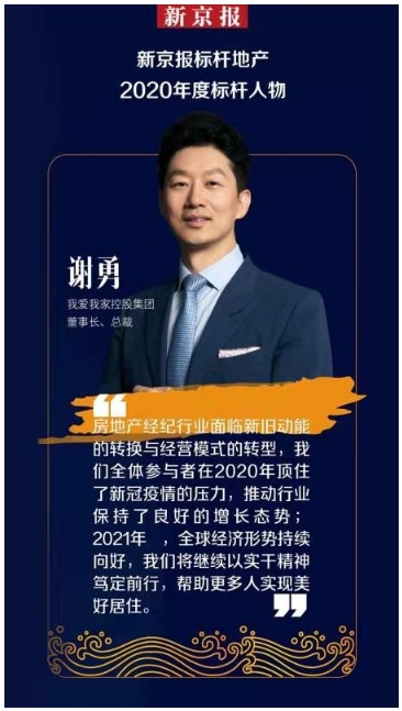 新年伊始,新京報(bào)標(biāo)桿地產(chǎn)挑選出在此特殊環(huán)境下為行業(yè)做出卓越貢獻(xiàn)的行業(yè)領(lǐng)袖,我愛我家集團(tuán)董事長謝勇與京投集團(tuán)、世茂集團(tuán)、碧桂園等企業(yè)領(lǐng)導(dǎo)人共同獲評(píng)“2020年度標(biāo)桿人物”。
