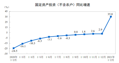 1—2月份,全國固定資產投資(不含農戶)45236億元,同比增長35.0%;比2019年1—2月份增長3.5%,兩年平均增速為1.7%。其中,民間固定資產投資26183億元,同比增長36.4%。從環比速度看,2月份固定資產投資(不含農戶)增長2.43%。
