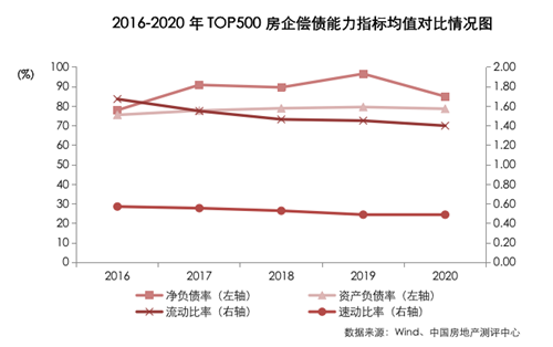 “三道紅線”監管下,TOP500房企杠桿率有所降低,降杠桿初顯成效。長期償債能力方面,TOP500房企2020年資產負債率均值為78.77%,較上年下降0.89個百分點,為2012年以來首次下降;凈負債率均值為85.08%,較上年下降11.62個百分點,相比2019年也有大幅改善。短期償債能力方面,2020年TOP500房企短期償債能力略有下降,流動比率均值為1.40,較上年下降0.05,速動比率均值為0.49,與上年持平。