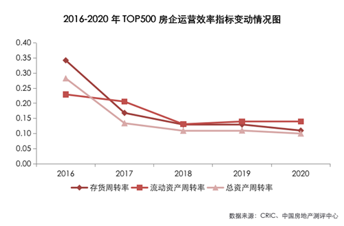 2020年TOP500房地產開發企業存貨周轉率均值為0.11,較2019年降低0.02;整體流動資產周轉率均值為0.14,與2019年持平;總資產周轉率均值為0.10,較2019年降低0.01。從三大運營指標看,總體數據依然處于低位。