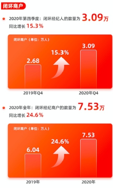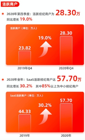 作為中國最大的獨立第三方經紀平臺,房多多始終將幫商戶簡單做生意放在首位,通過不斷優化SaaS產品和線下精細化運營,平臺經紀商戶規模已連續9年保持增長。財報顯示,2020年第四季度,房多多平臺上的活躍經紀商戶數為28.33萬,同比增長19%;2020年全年,平臺累計活躍經紀商戶數達57.72萬,同比大幅增長30.2%。2020年第四季度,在房多多平臺上完成閉環交易的經紀商戶數為3.09萬,同比增長15.3%;2020年全年,累計完成閉環交易的經紀商戶數達7.53萬,同比增長24.6%。