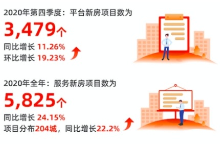 在房源端,房多多側重與重點開發商和項目保持深度合作,通過在SaaS產品中設置智能化盤源分級以及商戶、項目地圖,實現盤源精細化管理。第四季度,房多多進一步加強與全國百強房企的合作,平臺新房項目數為3,479個,同比增長11.26%,環比增長19.23%。2020年全年,平臺新房項目數為5,825個,較2019年同比增長24.15%;項目分布于全國204個城市,城市覆蓋數較2019年同期增長22.2%。