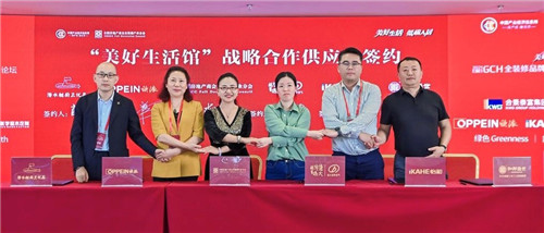 隨后,陳秘書長與供應商代表--潛水艇廚衛(wèi)優(yōu)品事業(yè)部總經(jīng)理薛榮先生、怡和衛(wèi)浴營銷中心副總經(jīng)理陳亮先生、歐派家居工程事業(yè)部副總經(jīng)理寧惠女士、遠大新風北部大區(qū)總經(jīng)理胡杰先生、和邦盛世工程總監(jiān)陳尚坤先生簽訂美好生活品牌館戰(zhàn)略供應商合約。