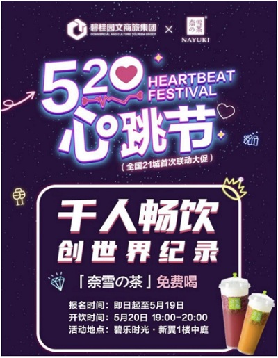 隨著“后浪”崛起,“Z世代”青年逐漸成為商業消費市場的主力軍。隨之而來的,是“顏值即正義”、“粉絲效應”、“網紅經濟”等新興消費趨勢。緊抓這一趨勢,碧桂園文商旅于此次心跳節探索“網紅營銷”,跨界網紅茶飲品牌 —— 奈雪的茶,推出“千人同飲奈雪”活動,并將嘗試申請史上最多人同飲奶茶的世界紀錄,展示了碧桂園文商旅在跨界營銷和聚焦年輕流量方面的突破式創新。