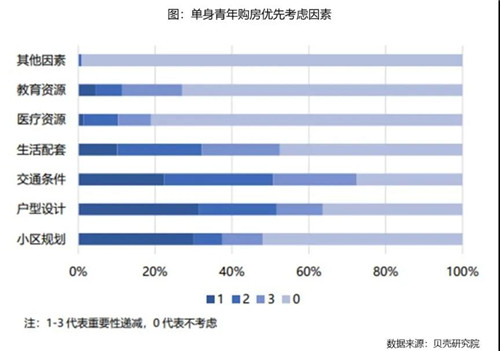值得關注的是,單身青年偏愛新房、小戶型。調研顯示,僅14.68%的單身青年傾向二手房,占比明顯低于戀愛或已婚狀態的21.6%和20.19%。購房理想面積80平方米以下的單身青年占比28.96%,超過已婚青年群體占比。此外,單身青年較為看重房屋周邊交通條件,戶型設計、生活配套及小區規劃,相對而言,教育、醫療資源對購房意愿影響較小。