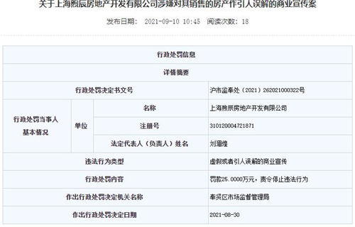 此外,行政處罰決定書《關于上海煦辰房地產開發有限公司涉嫌對其銷售的房產作引人誤解的商業宣傳案》(滬市監奉處〔2021〕262021000322號)顯示,上海煦辰房地產開發有限公司存在虛假或者引人誤解的商業宣傳的違法行為,奉賢區市場監督管理局對其罰款25萬元,責令其停止違法行為。