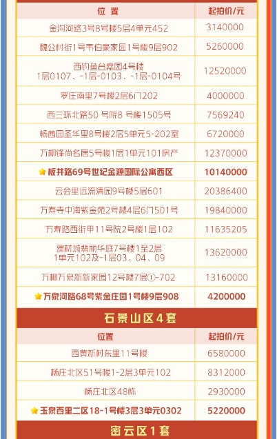 如果對房屋面積有更多要求,別墅大宅也在可選范圍之內。例如昌平區北七家鎮園中園別墅區的一套房產,兩層建筑面積為265.09平方米,起拍價為677萬元。海淀區云會里遠流清園9號樓的住宅,面積為254.83平方米,起拍價2038.64萬元。