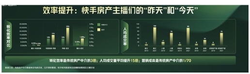 據今年7月份數據,隨著快手新型房產經紀模式的形成,快手房產主播的人均成交量平均提升15倍,營銷成本僅為傳統房產中介的1/70,轉化效率則是傳統房產中介的3倍。三線城市的快手主播“紅旗說房”,積累起用戶的信任后組建了一支300人主播團隊,僅用半年時間就實現7.5億元的銷售額,快手理想家在其中的作用功不可沒。