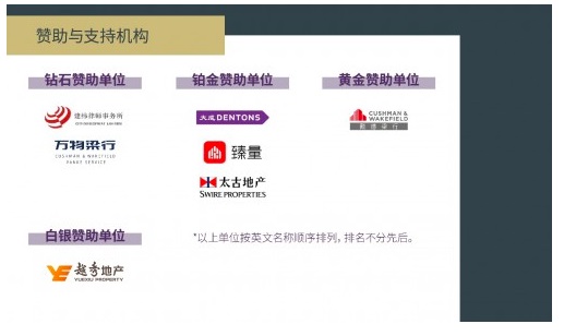 最后感謝建緯律師事務所、萬物梁行、大成律師事務所、臻量、太古地產、戴德梁行、越秀地產對本屆頒獎典禮的支持。
