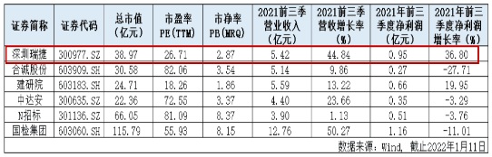 但從資本市場表現(xiàn)來看,業(yè)績頗佳的深圳瑞捷目前仍處于低估值階段。Wind數據顯示,截止2022年1月11日,深圳瑞捷市盈率為26.71,市凈率為2.87,兩項估值指標均低于合誠股份、中達安、招標股份、國檢集團等類同行上市公司,但其業(yè)績卻遠優(yōu)于這些上市公司。