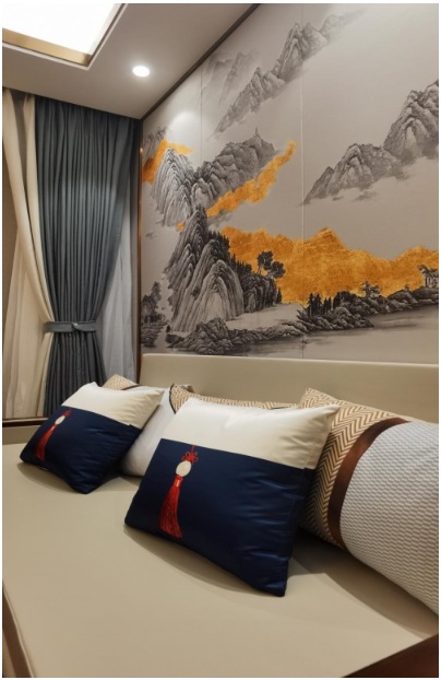 端莊素雅的書房,散發出濃厚的歷史文化底蘊,柔軟舒適的榻榻米沙發,搭配色彩對比強烈的山水絹畫護墻板,營造出獨具風采的和諧靜謐空間。