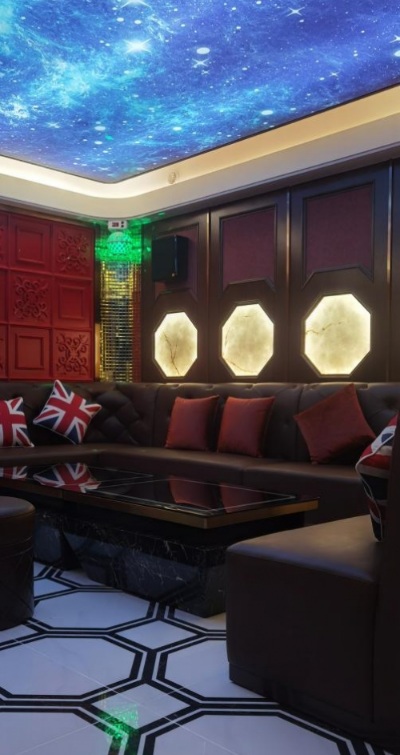 KTV休閑房的設計同樣別具匠心,燈光、幕頂、皮質沙發、紅色配飾,加上深色木質邊框作為背景,奢華大氣,又極具巧思,讓人不自覺地放松下來,是家庭休閑、節假日聚會的好地方。