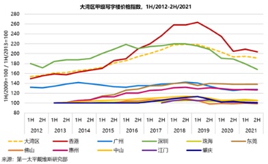 2021年下半年,盡管大灣區(qū)經(jīng)濟(jì)持續(xù)復(fù)蘇,但受奧密克戎席卷全球、市場(chǎng)供過(guò)于求持續(xù)、部分大型開(kāi)發(fā)商面臨一定資金壓力的共同影響,大灣區(qū)甲級(jí)寫字樓租金和價(jià)格指數(shù)分別環(huán)比下降1.9%和1.6%。