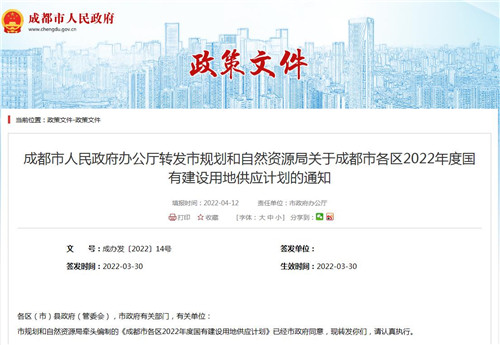 成都市各區2022年度國有建設用地供應計劃