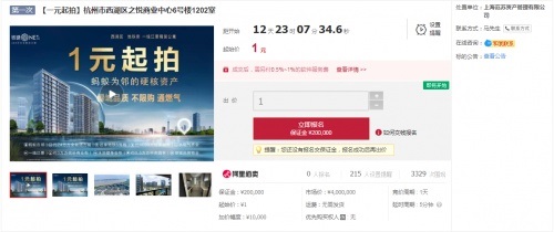 此次,阿里資產聯合開發商,將杭州市西湖區之悅商業中心6號樓1202室和1506室,也將于5月9日10時、5月12日10時以1元起拍賣。
