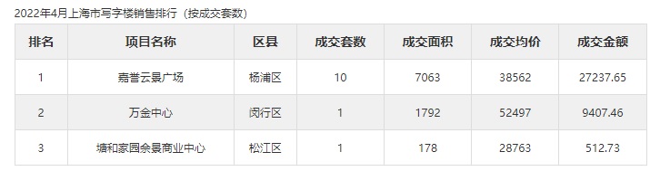 2022年4月,上海市寫字樓成交量前十的樓盤為:嘉譽云景廣場、萬金中心、塘和家園佘景商業中心。其中,成交套數最多的是嘉譽云景廣場共成交10套,成交面積為7063㎡,成交均價為38562元/㎡,成交金額為27237.65萬元。