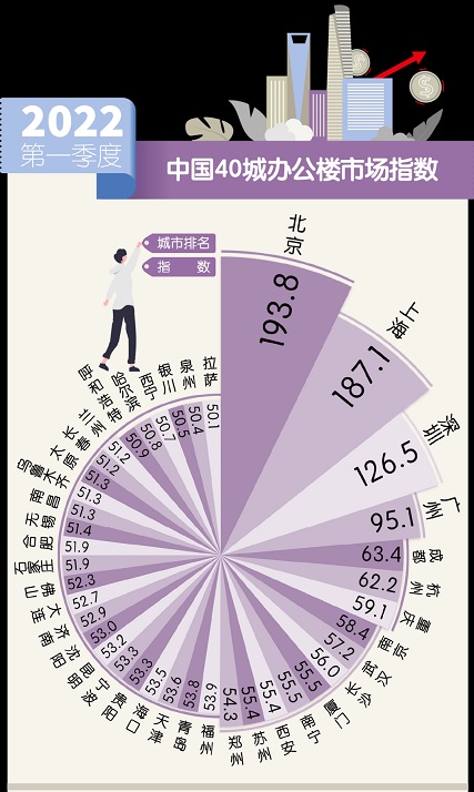 當前,各行各業已為中國的城市發展研究提出了多樣的概念和指標,比如宜居指數、夜生活指數、人才指數等。記者今日獲悉,針對商務辦公樓宇對城市發展的數據和分析尚且不足這一現狀,仲量聯行近日發布了中國40城辦公樓市場指數。該指數選取全國政治經濟重點城市,涵蓋了辦公樓市場的體量、運營指標和財務指標,是城市高品質辦公樓商業價值的量化,直觀反映了樓宇的經營情況(出租率)和市場主體的承付能力(租金)。結果顯示,2022年第一季度中國40城辦公樓市場指數,成都排名僅次于北京、上海、深圳和廣州,位列全國第五。