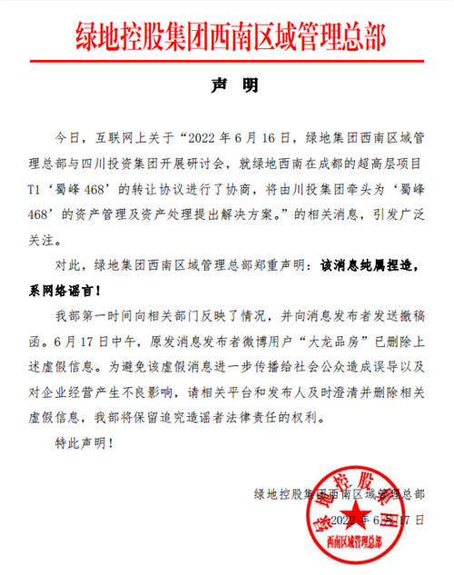 對此,綠地集團西南區域管理總部在聲明中表示:該消息純屬捏造,系網絡謠言!