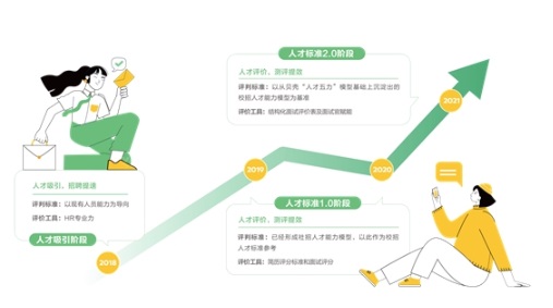 人才標(biāo)準(zhǔn)定義了企業(yè)需要什么樣的人才,是企業(yè)最基本的人才評價指引。校招人才標(biāo)準(zhǔn)的持續(xù)迭代也充分體現(xiàn)了貝殼閉環(huán)型校招組織的特性。在貝殼校招人才標(biāo)準(zhǔn)梳理, 從初創(chuàng)期的粗放型的經(jīng)驗階段,到基于社招積累形成初步校招人才標(biāo)準(zhǔn),再到現(xiàn)在“人才五力”模型為基礎(chǔ)的校招人才能力模型,引入科技評價手段、精細化評價標(biāo)準(zhǔn)和賦能 面試官缺一不可。