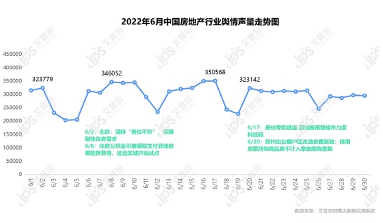 艾普思輿情大數據監測系統顯示,6月,涉及房地產行業的輿情聲量為8,873,611篇次,較上月略有下降,日均聲量達295,787篇次。其中,聲量極值出現在6月17日(單日聲量350,568篇次),主要受《房價降勢趨緩 因城施策穩樓市力度料加碼》《北京:堅持“房住不炒”,保障剛性住房需求》等報道的影響。