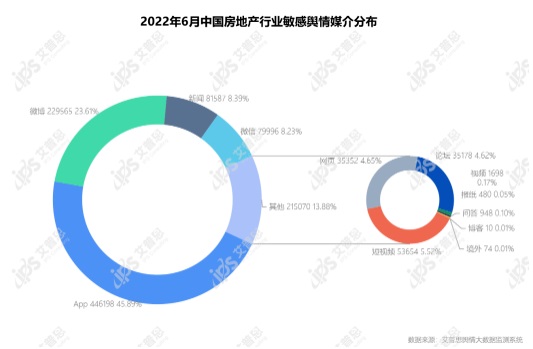 6月,房地產行業敏感輿情聲量來源中,占比最高的媒介為APP,達45.89%,輿情聲量為446,198篇次;其次為微博,輿情聲量達229,565篇次,占比23.61%;排名第三的是新聞,輿情聲量達81,587篇次,占比8.39%;其他媒介中,微信、網頁、論壇等媒介的總占比達13.88%,輿情聲量為215,070篇次。