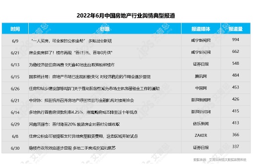 6月,房地產行業輿情典型報道有《“一人買房,可全家的公積金幫” 多地出臺新規》、《房企賣房拼了!樓市再現“首付5%、首年0月供”》、《為穩經濟促住房消費 9天逾40地出臺政策松綁樓市》、《國家統計局:房地產市場已出現積極變化 對經濟穩定的作用會逐步顯現》等,報道量排名前十的信息為: