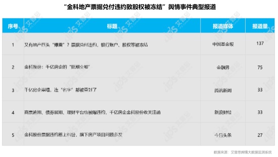 關于“金科地產票據兌付違約致股權被凍結”輿情事件的典型報道包括《又有地產巨頭“爆雷”?票據兌付違約,銀行賬戶、股權等被凍結》《金科股份:千億房企的“延期交卷”》《千億房企崩塌,連“名字”都被查封了》等,報道量排名前五的信息為: