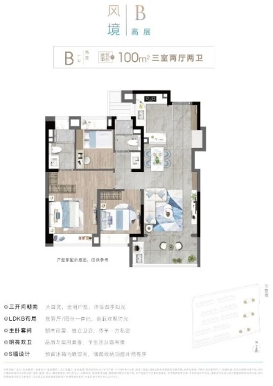 建面約100㎡的高層B戶型將南向三開間和餐客廳一體化設計完美融合。更在空間尺度上進行了大膽升級,尤其是南北通透的主臥套房設計,讓居住體驗達到極致舒適。