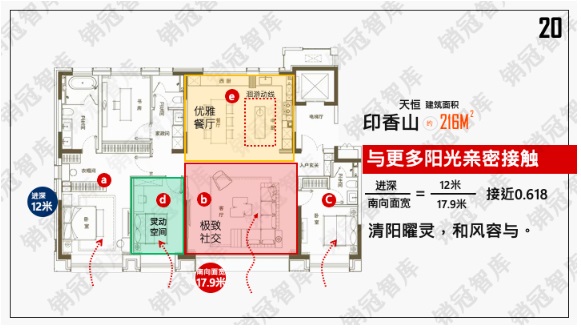 最夸張的數(shù)據(jù)是,印香山主力戶型216㎡平墅,南向面寬達(dá)到了17.9米!