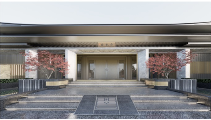 “禮”是秩序。望京國譽府大門,采用三進制入門禮制,營造前廳、序廳、正廳,彰顯門戶歸家秩序。其中前廳是大門外的露天區(qū)域,穿過前廳,拾階而上,即是巍峨的第一重儀門,“序廳”相當(dāng)于是屋檐的延伸,功能上增加了檐下灰空間,銜接“前廳”與“正廳”,起起承轉(zhuǎn)合之意。正廳為星級酒店式社區(qū)大堂,集合接待流線、歸家流線等多條獨立動線,互不干擾,給予更佳舒適的歸家體驗和儀制感受。