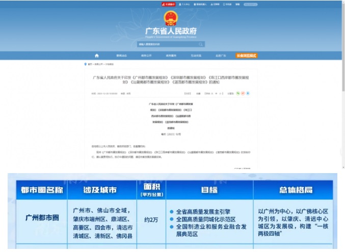 12月20日,《廣州都市圈發展規劃》正式頒布,由廣州引領,涵蓋佛山市全域,肇慶市端州區、鼎湖區、高要區、四會市,清遠市清城區、清新區、佛岡縣,旨在構建粵港澳大灣區高質量發展主引擎、同城示范區、全國制造業和服務業融合發展典范區。