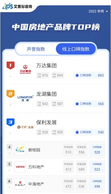 2022年線上口碑指數位列前三的房地產品牌為:萬達集團(口碑指數883)、龍湖集團(口碑指數560)、保利發展(口碑指數540)。其它上榜TOP50的房企包括:碧桂園、萬科地產、首創集團、雅居樂集團、招商蛇口、重慶兩江新區置業等。