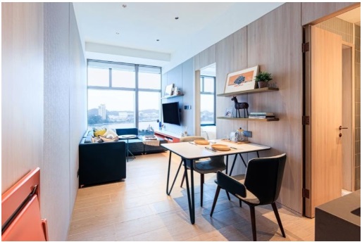 房間設計風格以自然原木為主基調,整體色調柔軟而溫暖,色彩靈感來自充滿活力而又溫馨的西九:坐擁西九貨運、藝術及文化樞紐的獨特位置,希望為途經的精英人士營造溫馨如家的感覺。房間空間貫通,視野開闊。餐臺和書桌的連貫設計提升了柜臺空間利用率,可折疊的沙發組合亦滿足白領精英于家中聚會交友的靈活需求。為充分利用特高樓底帶來的高采光度優勢,每間房的景觀落地窗都經由細致規劃,將窗外風光引入家中室內,提升全屋景觀。