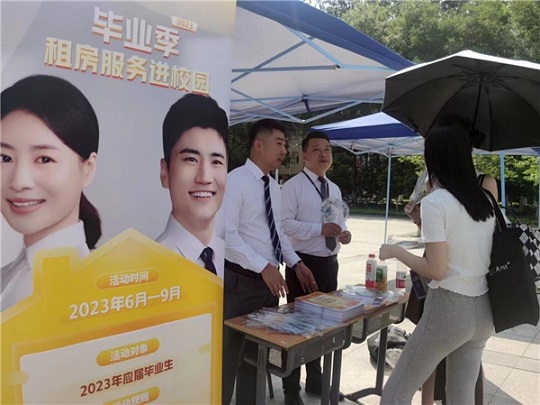 “我想租個便宜點,周邊又有地鐵的房子!”“我的工作地點在望京,附近有什么可以推薦的房子?”“公司有什么優惠舉措?”在北京工業大學的我愛我家展臺上,經紀人耐心解答大學畢業生每一個租房問題。作為住房租賃頭部企業,我愛我家積極響應并參與“畢業季租房服務進校園”活動,以黨建為引領,冒著高溫酷暑天氣走進中國地質大學、華北電力大學、首都經貿大學、北京工業大學、北京物資學院、中國戲曲學院等高校,以最大的優惠、最好的服務助力大學畢業生“住有所居”。