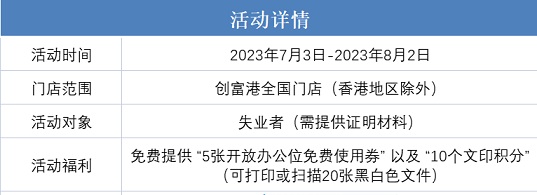 值得注意的是,該活動在提供免費辦公位的同時,還將附贈10個文印積分,可在創富港門店中打印或掃描20張黑白文件,該舉措也為用戶提供持續的便利和溫暖。