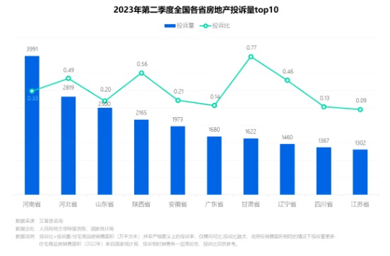 從地域分布來看,2023年第二季度河南省、河北省、山東省、陜西省、安徽省投訴量居前五,其中陜西省房地產投訴量較去年同期下降28.85%。