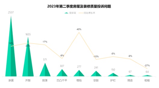 2023年第二季度,質量投訴中房屋及裝修質量相關投訴7769起,較去年同期增長9%;車位質量相關投訴523起,較去年同期下降15%;違章搭建、設計不合理相關投訴分別為288起、53起。