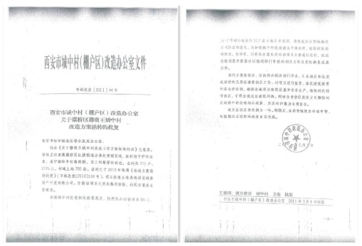 據(jù)葛林給記者提供的資料顯示,后在2010年,宏潤地產(chǎn)和穆將王商貿(mào)有限公司(原穆將王村委會(huì)無形改造后成立的集體企業(yè))簽訂了《穆將王城中村改造聯(lián)合開發(fā)合同修訂協(xié)議書》,將2008年1月批復(fù)的城改綜合用地297.6畝調(diào)整為420畝;原合同約定的18萬平方米的安置用房調(diào)整為地上13萬平方米住宅用房和地上2萬平方米的獨(dú)立商業(yè)用房;同時(shí)將原合同約定的2500萬元拆遷補(bǔ)償款調(diào)整為1.4億元,后報(bào)請西安市城改辦審核。2011年3月,西安市城改辦下發(fā)了市城改發(fā)〔2011〕44號(hào)《關(guān)于灞橋區(qū)穆將王村城中村改造方案結(jié)轉(zhuǎn)的批復(fù)》,同意將綜合改造用地調(diào)整為420畝。葛林向記者出示了2008年城中村改造實(shí)施方案批復(fù)和2011年城改方案結(jié)轉(zhuǎn)批復(fù)。