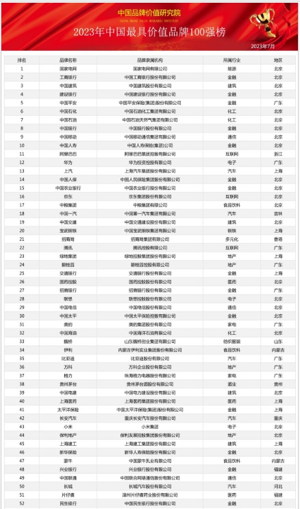 近日,2023年中國(guó)最具價(jià)值品牌100強(qiáng)排行榜發(fā)布,這是中國(guó)品牌價(jià)值研究院對(duì)我國(guó)品牌建設(shè)、未來(lái)發(fā)展?jié)摿熬C合市場(chǎng)競(jìng)爭(zhēng)力進(jìn)行全面、科學(xué)、獨(dú)立的品牌價(jià)值發(fā)展調(diào)查研究宣傳發(fā)布工作。通過(guò)對(duì)全國(guó)34個(gè)省(區(qū)、市),共計(jì)3500個(gè)重點(diǎn)品牌,行業(yè)涉及汽車制造、房地產(chǎn)開(kāi)發(fā)、醫(yī)藥生產(chǎn)、食品飲料、紡織服裝、金融IT、家具建材等38個(gè)行業(yè),進(jìn)行了數(shù)據(jù)采集研究,基于對(duì)財(cái)務(wù)分析、消費(fèi)者行為分析和品牌占有率分析確定候選品牌,邀請(qǐng)100位企業(yè)高管、學(xué)者及官員對(duì)經(jīng)資格審核符合要求的品牌進(jìn)行評(píng)選,比照國(guó)際上通行的做法,主要根據(jù)企業(yè)近三年的主營(yíng)收入、主營(yíng)利潤(rùn)、總資產(chǎn)、凈資產(chǎn)、研發(fā)投入、廣告投入等指標(biāo),推測(cè)品牌未來(lái)可能帶來(lái)的超額利潤(rùn),再結(jié)合行業(yè)特點(diǎn)、市場(chǎng)狀態(tài)、品牌市場(chǎng)地位、品牌歷史等因素,對(duì)候選品牌進(jìn)行綜合評(píng)分排出,并對(duì)部分候選品牌進(jìn)行實(shí)地拜訪,從中遴選出100家最具價(jià)值的品牌。在此基礎(chǔ)上通過(guò)與全球品牌500強(qiáng)進(jìn)行綜合對(duì)比分析,進(jìn)而有針對(duì)性地提出促進(jìn)中國(guó)品牌做強(qiáng)做大做久的對(duì)策建議,在全國(guó)范圍內(nèi)形成了巨大的社會(huì)影響力。