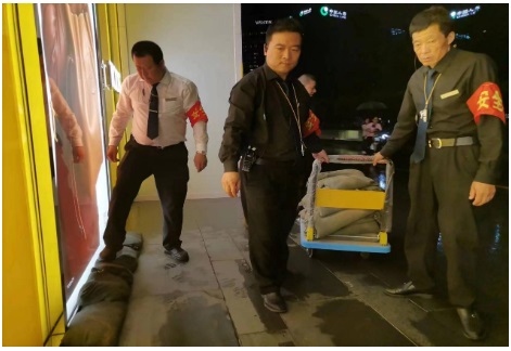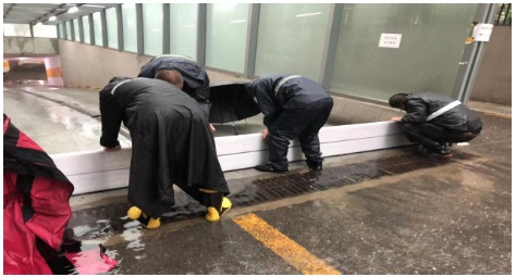 秩序人員在地庫出入口穩固防汛沙袋,守護業主的生命財產安全。