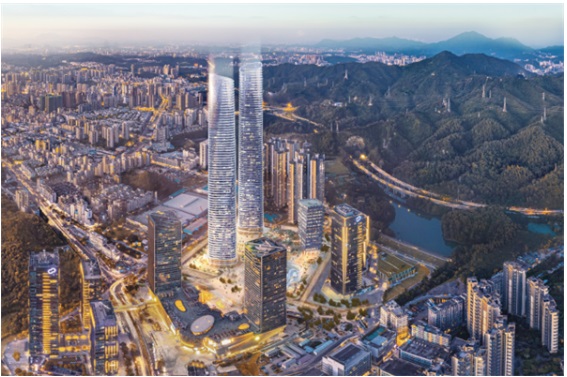 坐落于深圳市龍崗區坂田街道,疊加都市核心區和世界級電子信息產業集群,承載雙重區位優勢。總建筑面積逾36萬㎡,由東西等高雙塔組成,地上73層,將涵蓋高端商務辦公、直升機停機坪、空中企業總部大堂、共享會議中心、員工餐廳等垂直功能,創造一座容納近3萬人工作與生活的天際“立體城市”。