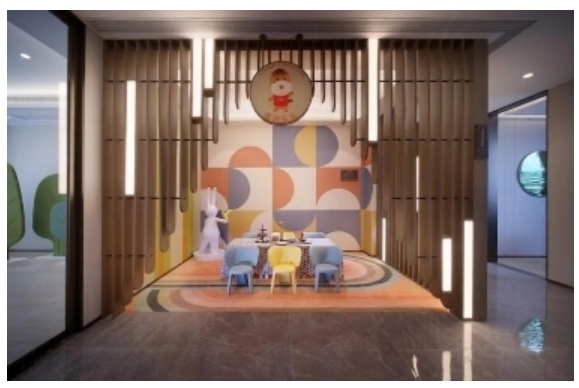 親子教育區:圍繞沉浸式親子互動展開的娛樂區,童趣、歡樂的裝修視覺語言,在這與孩子一同閱讀、繪畫、拼搭積木,娛樂設施圓角化處理,更加安全,寓教于樂的場景搭建,實現家庭歡聚的“圓滿”。