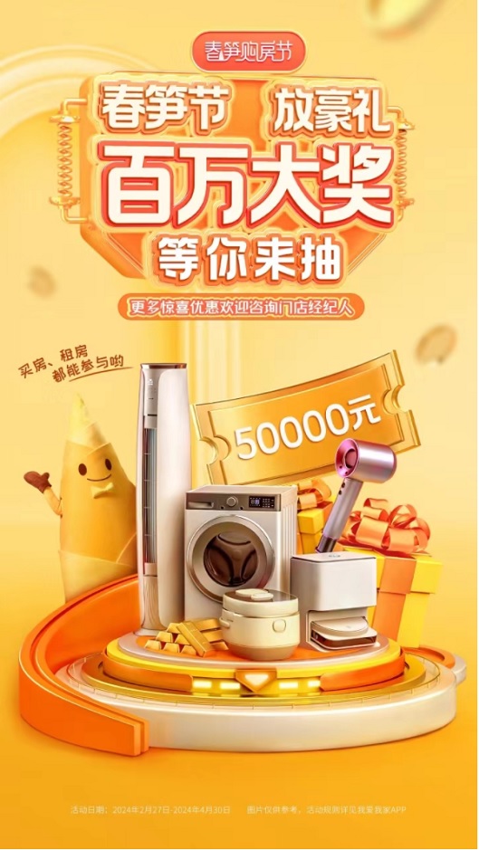 我愛我家相關(guān)負(fù)責(zé)人表示,作為居住服務(wù)行業(yè)的知名品牌,我愛我家深知每一個成交背后都承載著一個家庭對美好生活的向往,我愛我家始終以客戶為中心,以“激發(fā)每個人、每個家庭、每個城市關(guān)于家的更美好向往”為使命,盡己所能托舉每一個安居夢。第二屆“春筍購房節(jié)”的啟動,承接購房者的安居熱忱,幫助剛需和改善型人群有其居、優(yōu)其居,更將真誠心意和好禮一同送出,助力每個人都能住進(jìn)自己的理想生活,共同推動城市活力的生生不息。