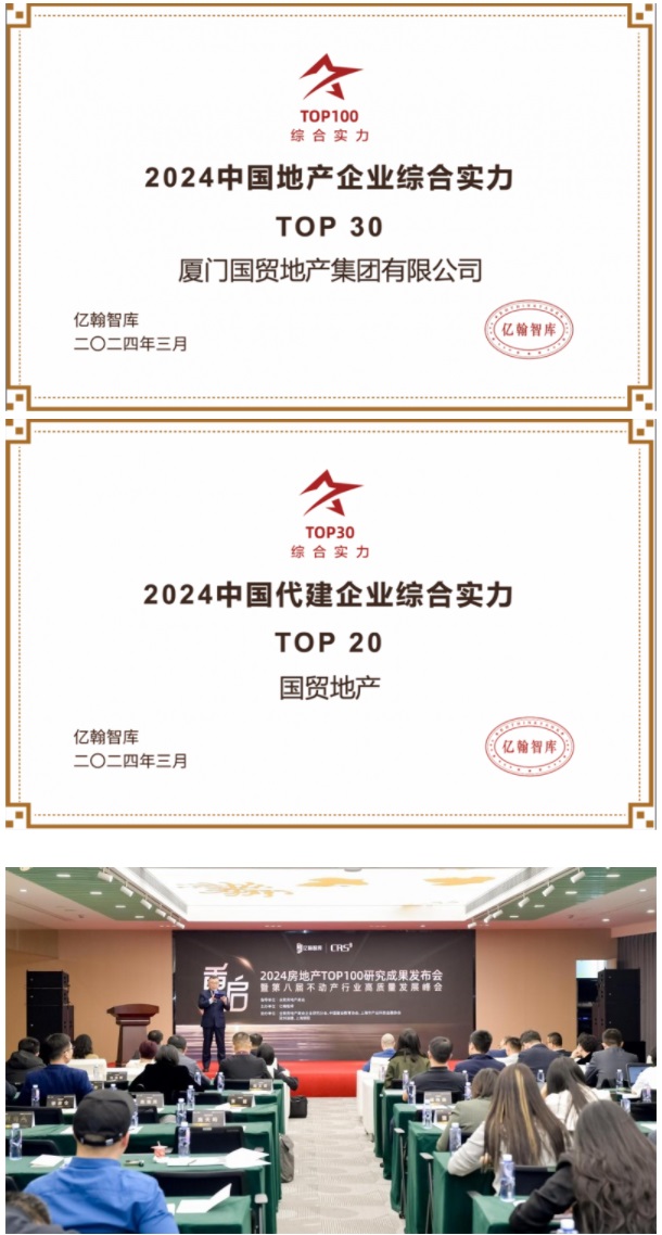 3月29日,由億翰智庫主辦的2024房地產(chǎn)TOP100研究成果發(fā)布會在上海舉行,國貿(mào)地產(chǎn)榮獲選2024中國地產(chǎn)企業(yè)綜合實力TOP30、2024中國代建企業(yè)綜合實力TOP20兩項大獎。
