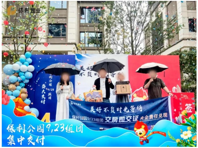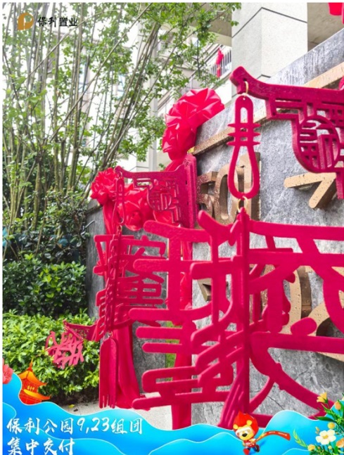 早上十點,業主們陸續抵達現場,工作人員在入口處熱情迎接每一位業主,為他們發放交付資料和精美禮品。業主們在主題背景板前合影留念,記錄下這一重要的時刻。背景板上“美好不負時光等待,貴陽保利公園9/23組團盛大交付”字樣格外醒目,傳遞出保利置業對業主的美好祝愿。