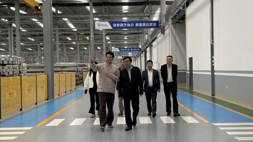 徐志強總經理陪同孟繁軍會長一行參觀了新建成的二分廠,二分廠致力于工業鋁型材:涵蓋智能汽車及關鍵零部件、新能源應用等領域;徐志強總經理向大家詳細介紹了新投入的7500T的大型擠壓機,自動淬火、裝框系統,國內領先的模具、粉末、素材、成品立體倉儲庫,可以實現鋁材生產過程產品不落地;為配套工業型材的生產,二分廠還投入了自動熔鑄生產線,采用最新的傾動爐技術,電磁攪拌技術,側墻精煉技術等,在線除氣、在線過濾、管式過濾技術,配套自動鋸棒系統、在線探傷、均質爐等先進裝備,滿足工業鋁材對不同合金牌號的需求。