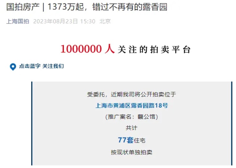 本站翻閱上海城投年報了解到,除兩棟文保建筑外,露香園還有部分原用以出租的服務(wù)式公寓,在2022年轉(zhuǎn)變?yōu)樽≌a(chǎn)權(quán),開始對外銷售,可售面積12205㎡,推廣案名為馥公館,均價10.3萬/㎡。馥公館銷售方式與上述類似,先由中介推廣尋找意向買家,再在上海國拍網(wǎng)上走拍賣流程。